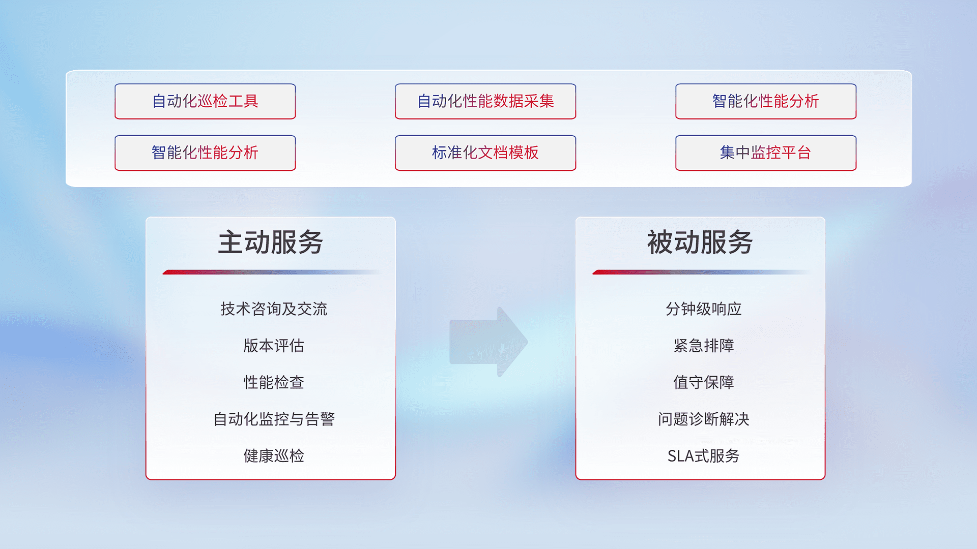 智能化工具和标准化文档,,,保障服务质量,,,提供主动服务(包含技术咨询、、、版本评估、、、、性能检查、、、自动化监控与告警、、、健康巡检)和被动服务包含(分钟级响应、、、、紧急排障、、值守保障、、问题诊断解决、、、、SLA服务)。。。